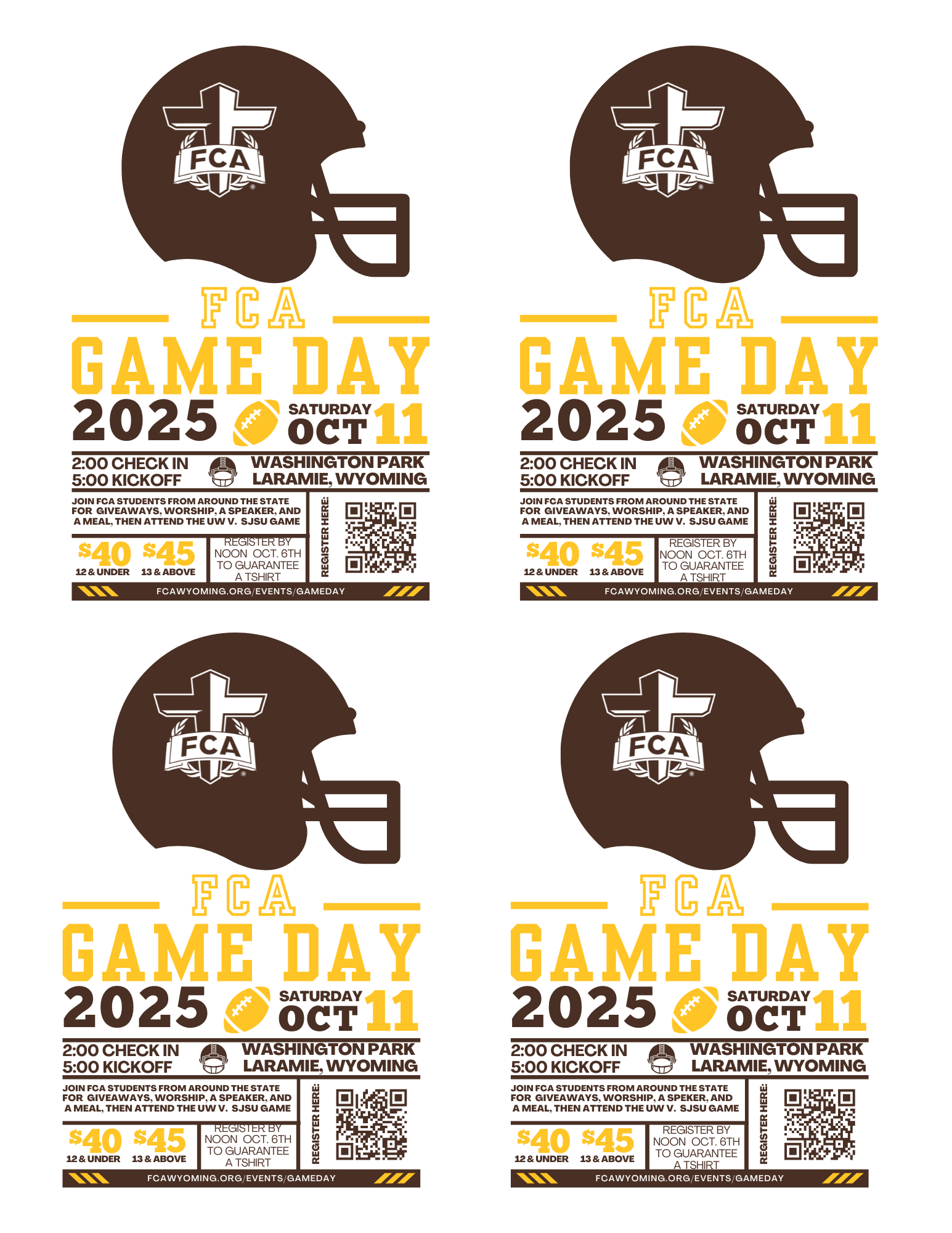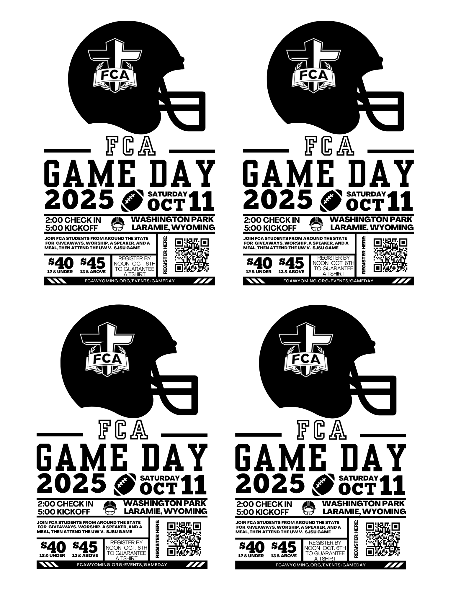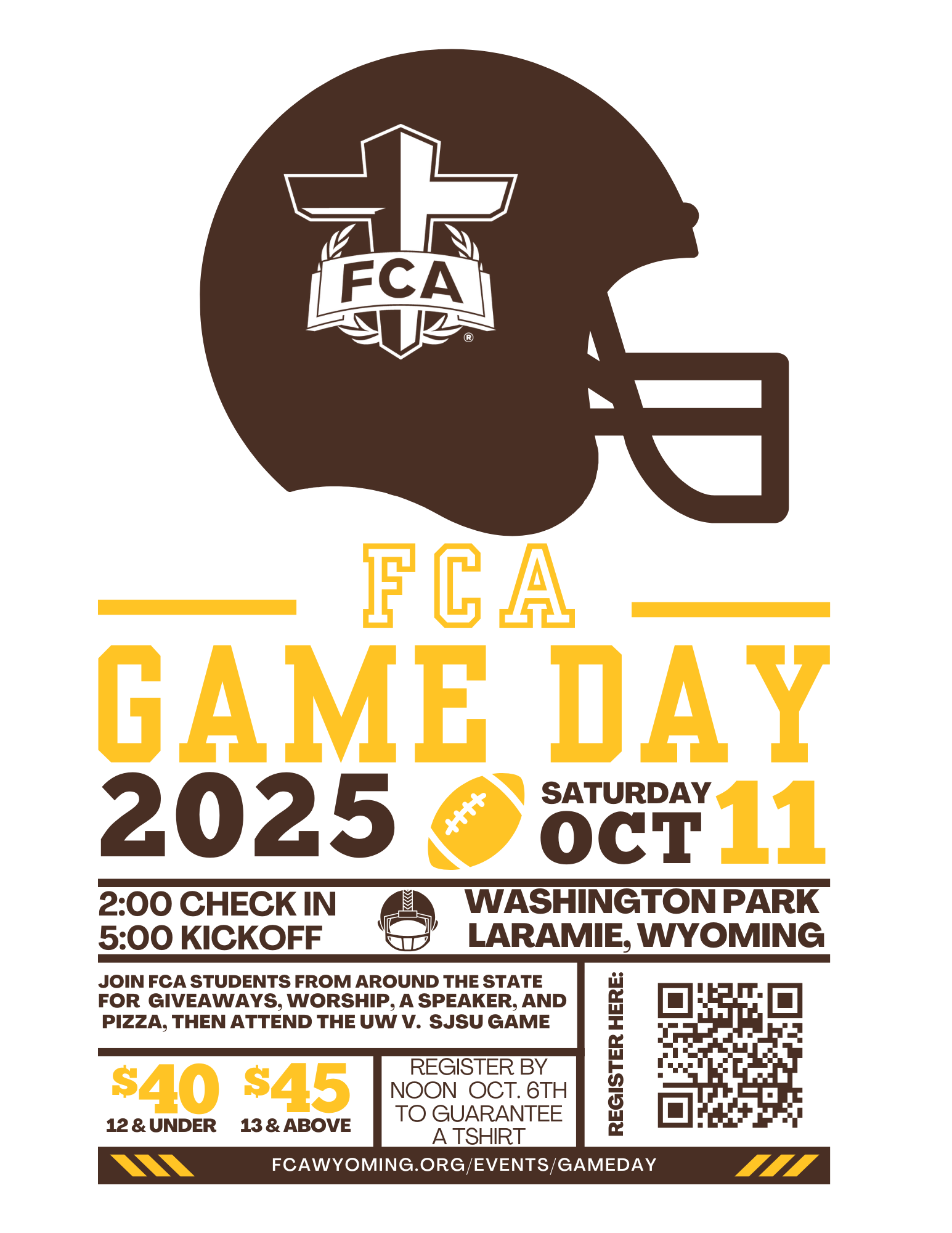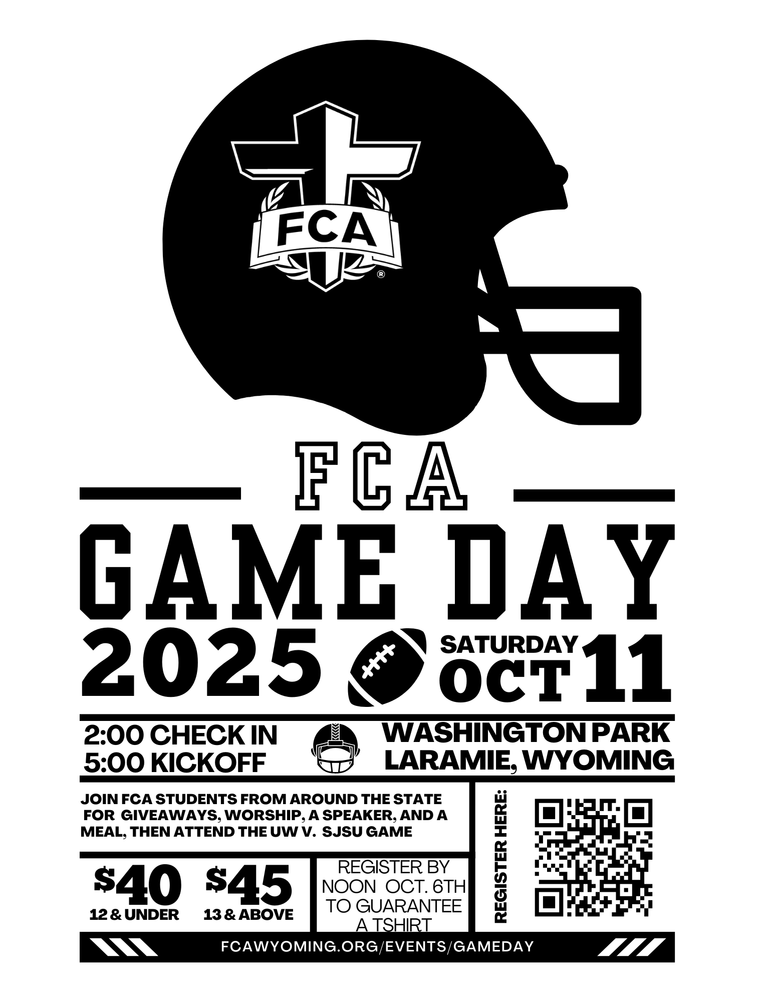 What it is: Game Day is an FCA Program centered around a Wyoming Football game, and includes a pregame rally with giveaways, food, speakers, and worship. Following the football game hear testimonies from current UW Football athletes.